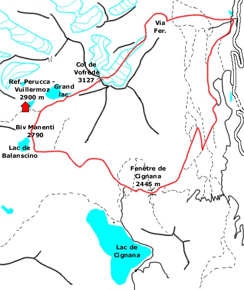 le col et descendre par une trace vers le Grand Lac. Retrouver le