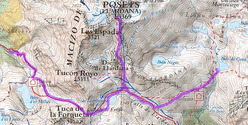 de l'ibon d'es Millars et le col de Eriste, la sente serpente