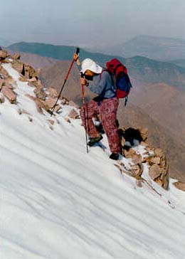 Le Maroc, un pays étonnant...Ayant appris avec surprise qu'il y avait des sommets de plus de 4000 m au Maroc, nous avons voulu en savoir plus. Vous n'aurez que peu de photos et de détails sur notre raid, cela remonte déjà à octobre 99, par contre ce qui peut vous intéresser c'est la façon dont nous avons préparé ce trek. D'abord, nous voulions faire un circuit à deux seulement ; le Maroc est tellement touristique, nous n'avions aucune envie de nous retrouver coincé au milieu des groupes de randonneurs type UCPA, Terre d'av...(on en a croisé, sur un petit sentier, ils étaient 40 tous comptés à la queue leu leu, pas bon le dépaysement !) D'autre part, n'ayant jamais organisé un trek à l'étranger, il nous fallait trouver un guide local et si possible depuis la France (l'aventure oui, mais sur un séjour aussi court le guide LOCAL nous permettait de rencontrer la population locale et de sortir des sentiers battus) Nous avons donc cherché des cartes avec ces 4000. Notre dévolu est tombé sur le Toubkal plutôt que sur le M'Goum car le M'Goum nous paraissait trop isolé, alors qu'il y a de jolies crêtes entre 3800 et 4100m tout autour du Toubkal, de quoi faire une véritable moisson !